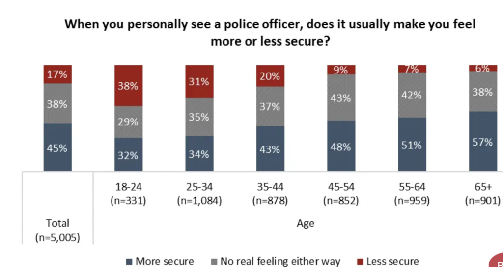 As shown in the table above, young drivers aged 18-24 are most likely to feel less secure when they interact with a police officer. In comparison to the older demographic who are more experienced, are more likely to feel secure when they get encounter by an officer.